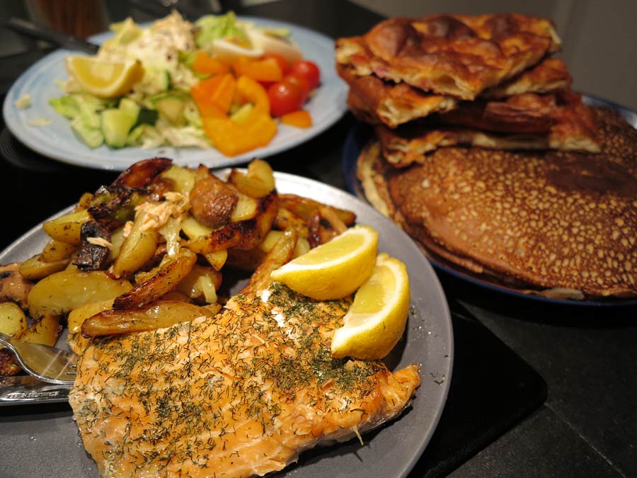 Firar en ekonomiskt svajande, men utmanande och rolig, vår med extra god middag för hela familjen. Pannkakor – både tunna och med fläsk till barnen, ugnsbakad lax och klyftpotatis med romsås och mumsig sallad till mig och Jonas. Bra fredag!