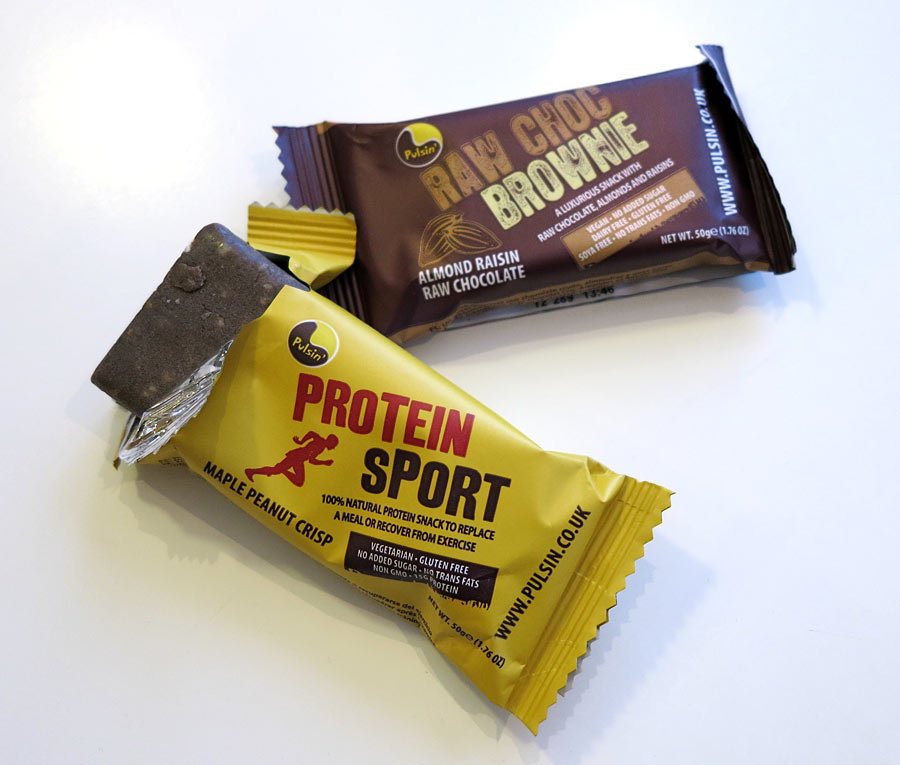 - Pulsin´Raw Choc Brownie Bar: ”Brownie på det nyttiga sättet” utan socker, gluten, mjölk eller ägg. Väldigt kompakt med ingredienser som kallpressad kakao, cashewsmör, russin och vaniljfrön. Smaken är ”vuxen” och jag gillar mörk choklad och tycker den var god. Innehåller bara 4,3 g protein och 27 g kolhydrater och passar därför bra energibar t.ex. vid långlopp som Vasaloppet. Pris 25 kr på Bodystore.