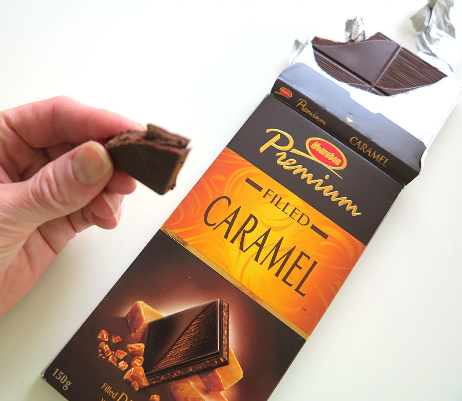 Eftersom det är fredag och officiellt helg (efter kl 12 va?) var jag tvungen att smaka en bit i samband med det arrangerade fotandet. Mörk choklad med krispig fyllning av knäck och krokant – VARNING för godhetsdöden!