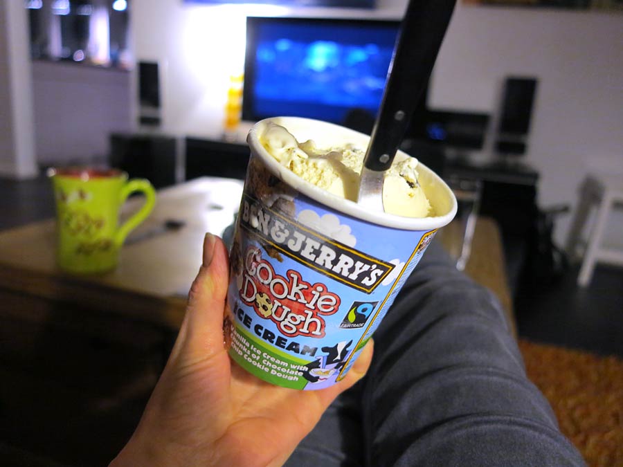 Så. Nu ska jag snart plocka fram min B&J från frysen (bilden är från en annan kväll, men det blir favorit Cookie Dough även ikväll). Kanske är HFHC (High Fat High Calorie) nästa trend? Jag hoppas inte det (fatta vilka hälsoproblem folk får DÅ till jämfört med ”hälsohetsen”), men en kväll framför Melodifestivalen känns den dieten helt rätt. För mig 🙂