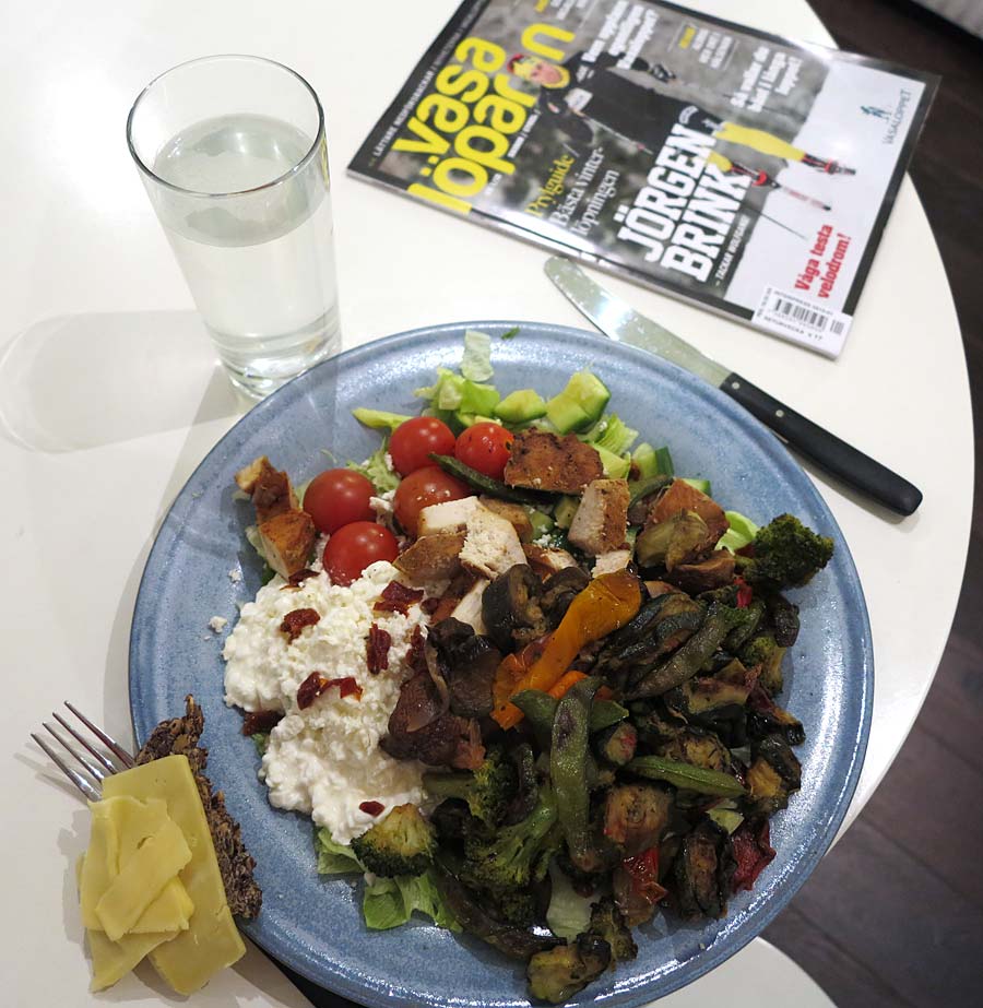 Och efter dusch lunch med mer skidinspiration som lektyr. Sallad med bl.a. frästa grönsaker, kyckling, keso, smulad fetaost och strimlade soltorkade tomater. Till detta ett par ostmackor (ja, det blev fler) och vatten. Mer kolisar i kväll.