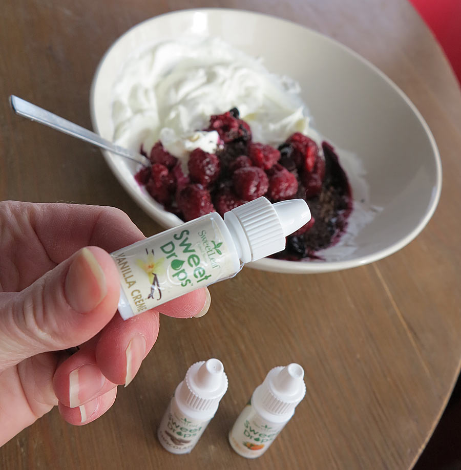 Smaksatta droppa sötade med koncentrerad Stevia i flytande form, SweetDrops av märket SweetLeaf, har testats i morgonens kesella. En klick kesella med chokladsmak, en med vanilj och en med persika ihop med bär och frön. Faktiskt gott och inte så syntetisk smak som jag trodde det skulle vara. Chokladen var jag mest skeptisk mot men den smakade riktigt kakao och kan säkert vara god i varm mjölk -bättre än i kesella som ändå funkade.