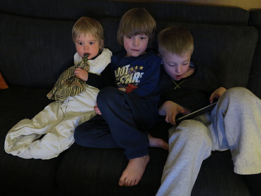 Och medan jag stillade Jonnas utbrott såg det ut så här i soffan. Lugna (ja, just då) grabbgänget som jag nu ska få i säng. Det där med TV och egentid på kvällarna var länge sen. Nu är det brottning som gäller men jag gillar ju att träna och än så länge vinner jag 🙂