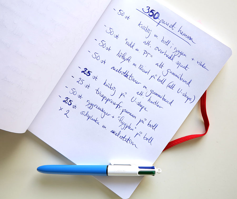 Så här såg dagens upplägg ut. Egentligen heter konceptet ”300-passet” men jag ville få in fler övningar som axelrotationer eftersom min kund behöver stärka axlarna, så det blev ett 350-pass. Annars går det ut på att du ska göra 300 repetitioner totalt och du bestämmer själv när du tar pauser för att klara alla. Målet är att köra hela passet på så kort tid som möjligt med bra teknik.