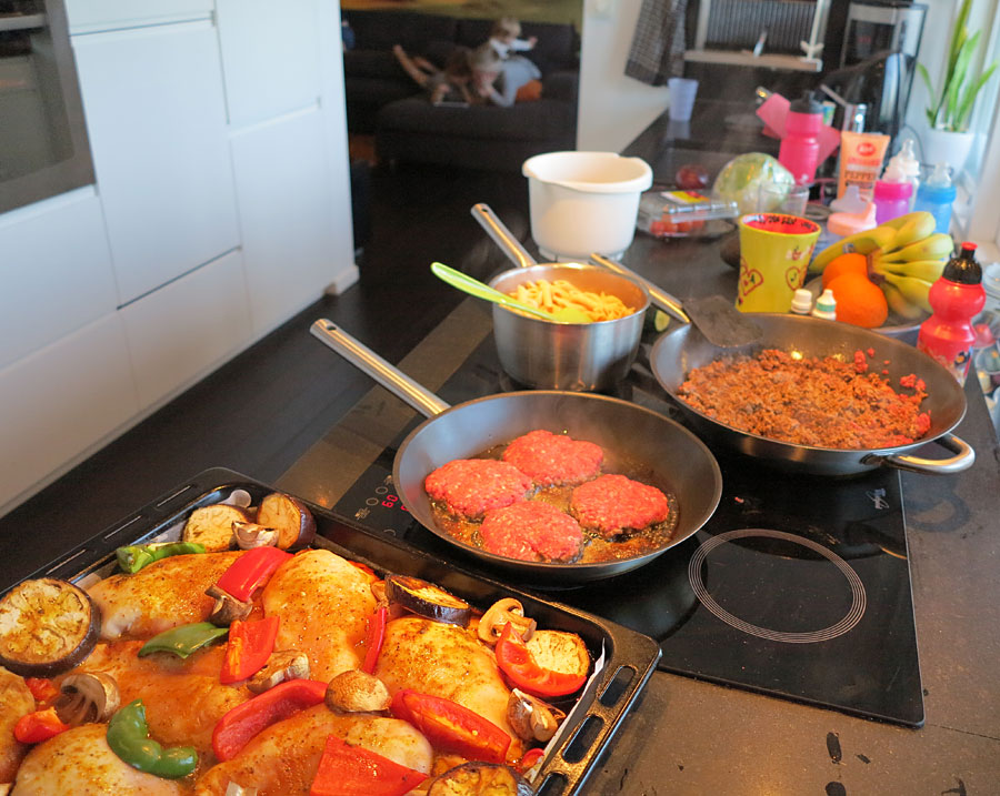 Det är viktigt med egentid, att hinna sakna och få distans till vad man faktiskt har och det går ruskigt snabbt att komma tillbaka till vardagen. Jonas och barnen vällde in med pussar, kramar, bråk, bad och hårtvätt x 4, storhandling och nu – storkok inför veckan medan jag skickat trötta pappan på uppiggande kur till gymmet. Som vanligt gör jag för många saker samtidigt och har både fixat köttfärsås med pasta, en plåt kycklingfilé att ha till stressiga dagar i veckan, samt hamburgare till dagens middag.
