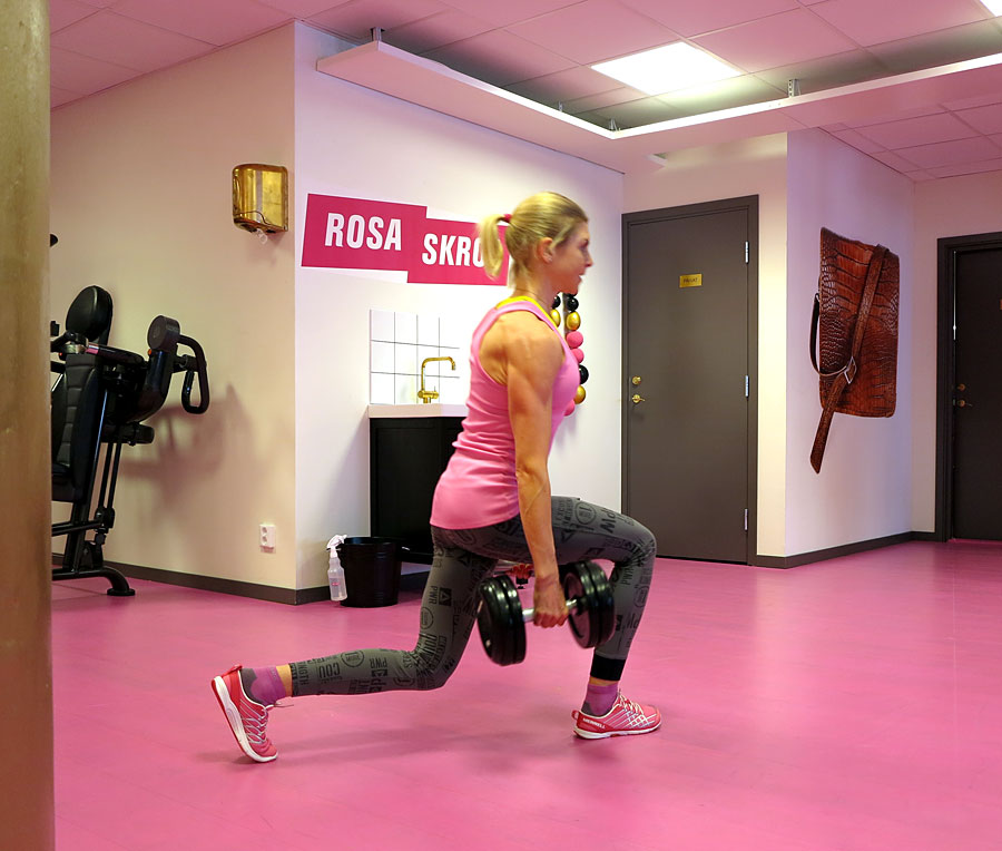 • Utfallsgång med hantlar (bild ovan) – Overhead squats med tom pumpstång upp mot taket, 4 superset