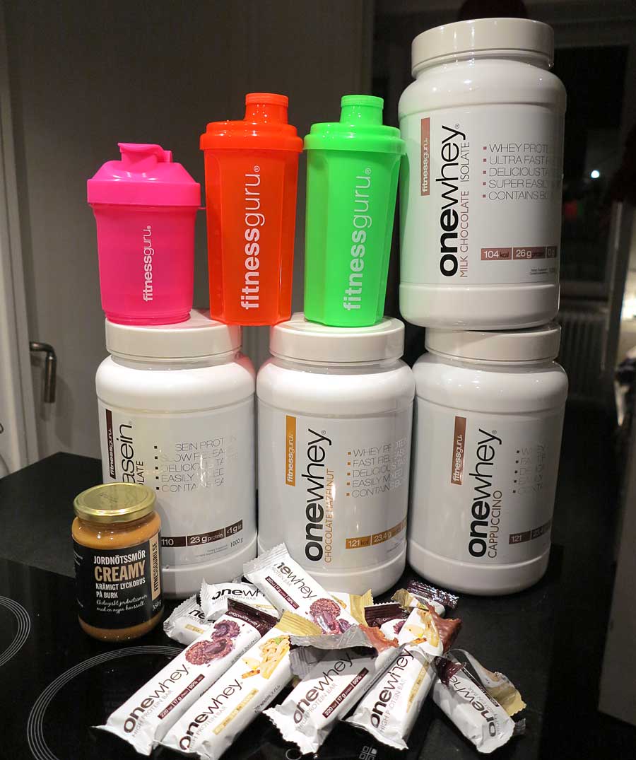 Hur som helst – jag äter det mest för att jag tycker det är gott, men även för att det är ett smidigt sätt att få i mig protein på som jag tycker ger bra svar på min kropp. Har nyligen fått hem provsmaker på Fitnessgurus proteinpulver, bars, jordnötsmör och nudlar. Hittills har jag testat bars med äppelpajsmak och chokladsmak (godisgoda) och proteinpulvret med kaseinprotein och vassle. Samtliga goda men favoriterna blev One Whey med Chocolate Hazelnut och Cappuccino. Även One Whey Isolate (kolhydrat- och fettfritt vassleisolat – därför lite dyrare och snabbare upptag) med smaken Milk Chocolate var en favorit av sorterna och har bäst sammansättning.