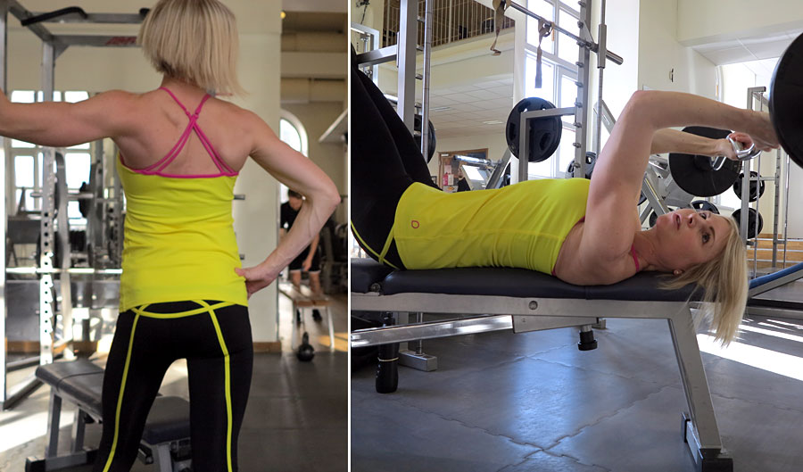 • Smala excentriska chins – Tricepspress från pannan med z-stång (bild ovan), 4 superset