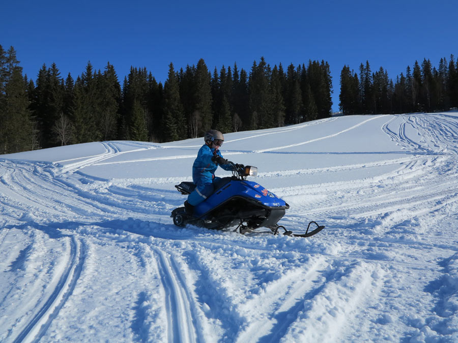 Lycklig 7,5 åring. Hugo har fått låna en miniskoter att fräsa runt med på gården.