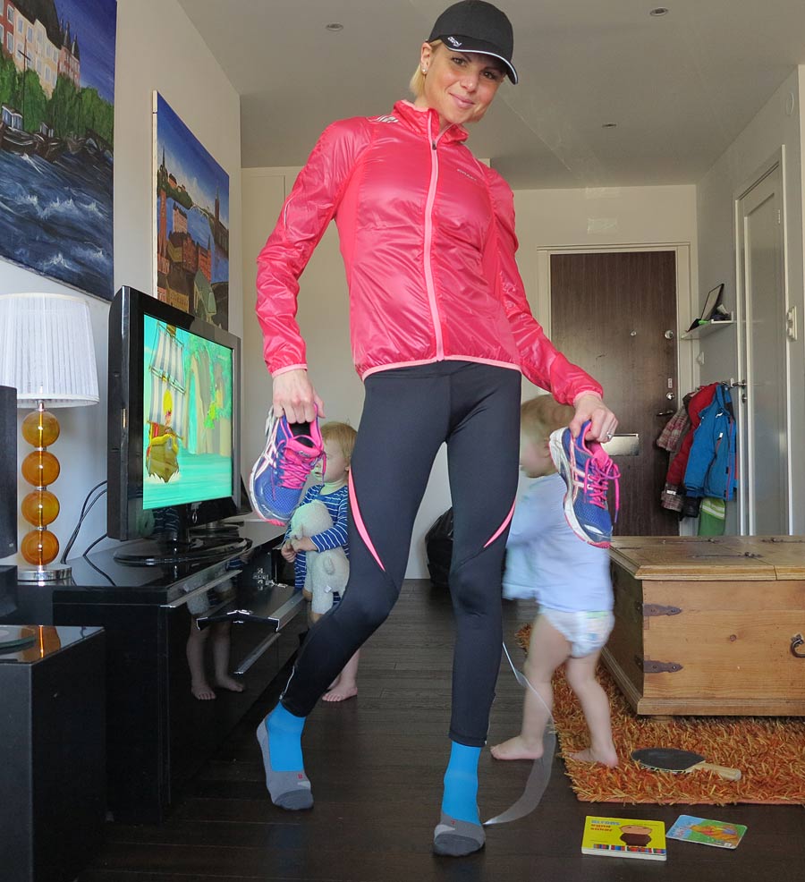 Yttersta lagret är en tunn vindjacka och keps från Craft, matchande tajts från Röhnisch, långa kompressionstrumpor från Gococo och skor från Asics. Jackan är egentligen för cykling men jag kunde inte hålla mig 🙂