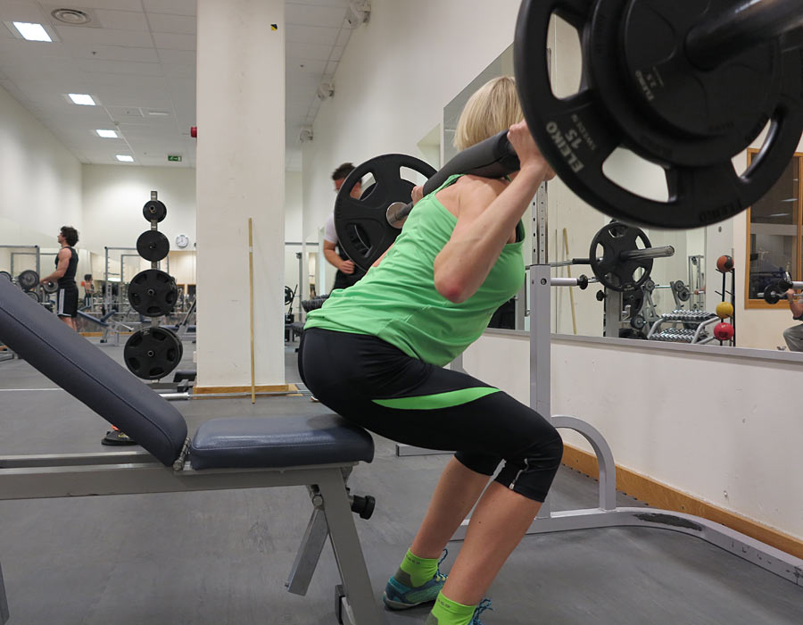 Knäböj – stående övning på mina benpass. Ända ner och dippa rumpan i bänken är det som gäller. OCH stark core! Ser på bilden ovan att jag inte hunnit dra åt korsetten innan kameran fotade (som jag gör för att skydda ryggen – inte bara för att ”se snygg ut” på bild :).