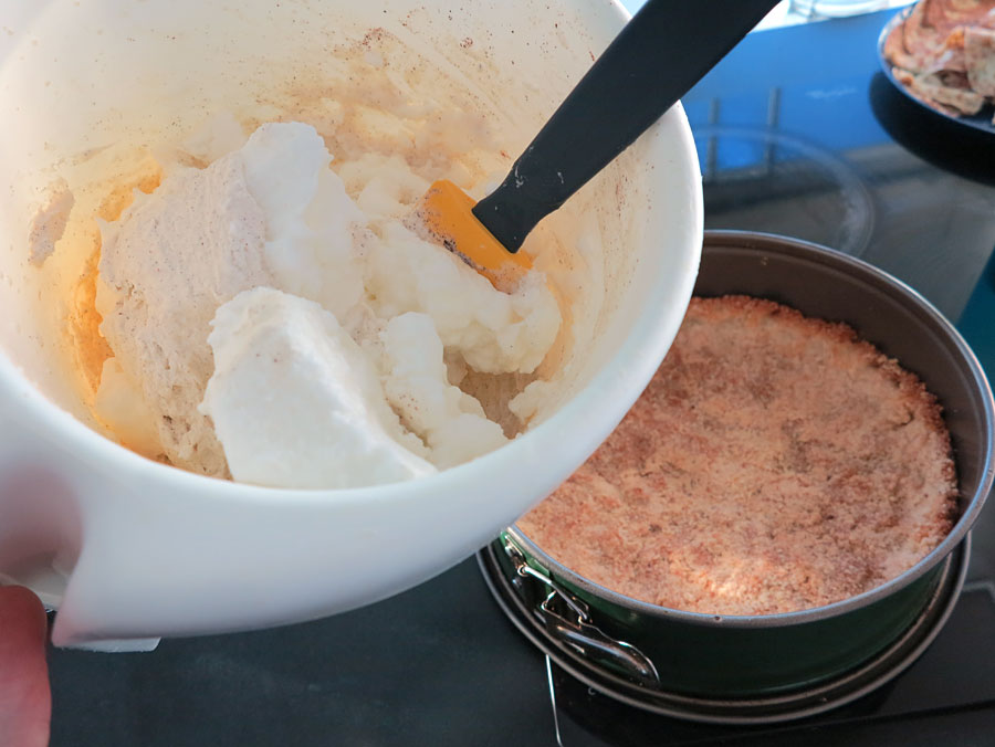 - Blanda allt försiktigt och häll över den avsvalnade pajbotten.