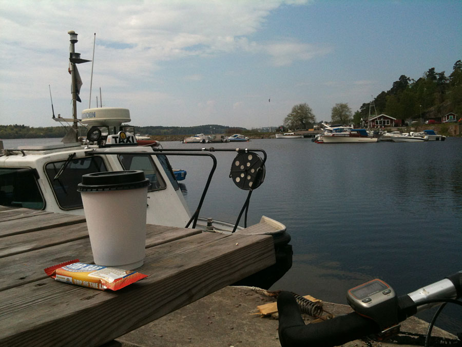 Men idag, efter 6 mils cykling, smakade en kopp kaffe och chokladbar vid OK på Lidingö som rena rama gorurmetmåltiden. En kvart att ladda om med blicken över glittrande vatten.