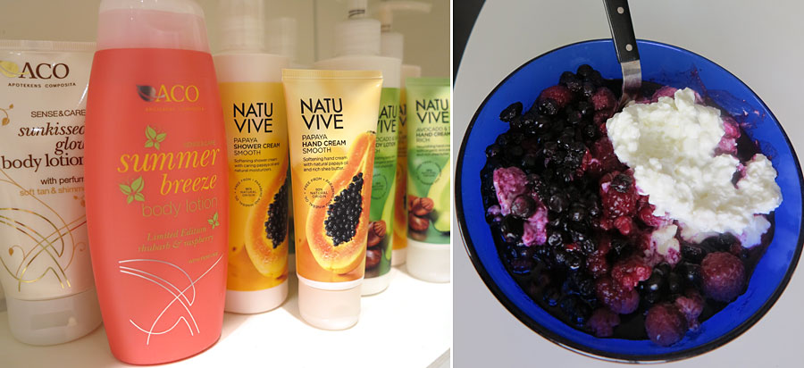 Mer sommarfeeling i/efter duschen. Enligt flera producenter av hudvårdsprodukter, bl.a. Aco och Natuvive som jag fått hem prover från, ska vi dofta frukt i sommar. Jag förknippar också frukt och bär med sommar och äter mer av den varan under denna del av året när det är lättare att få tag på mer färskt. Hade inga somriga jordgubbar hemma idag, men hallon och blåbär + kesella/kesomix dög fint som pre middagsmellis.
