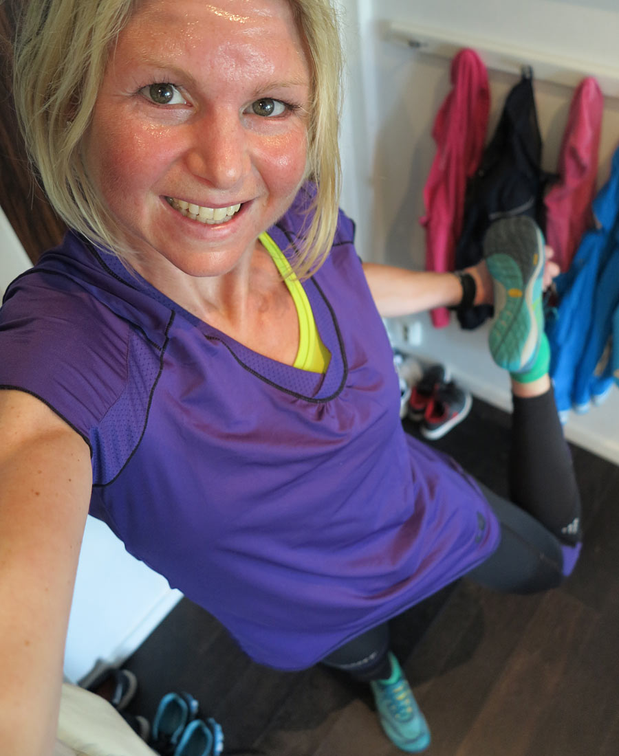Dagens löpoutfit: T-shirt och tajts – Craft, sport-bh – Casall, strumor – Gococo, skor – Merrell Pace Glove.