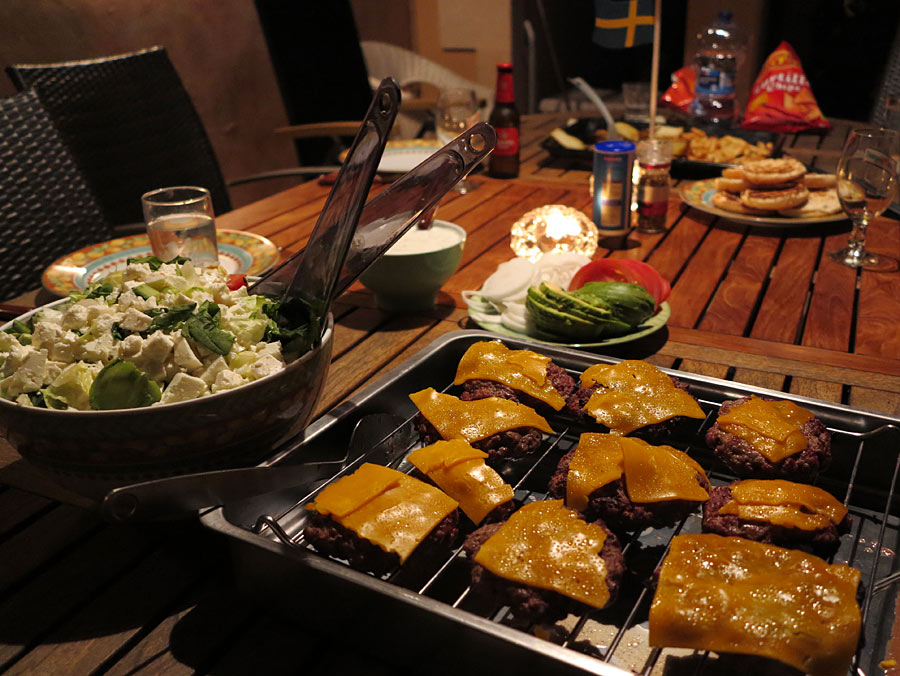 Middag: Grillad hamburgare med cheddarost, fetaostsallad, vitlökskesella, potatisklyftor, avocado och färsk lök. Tänk att lök kan vara så gott!