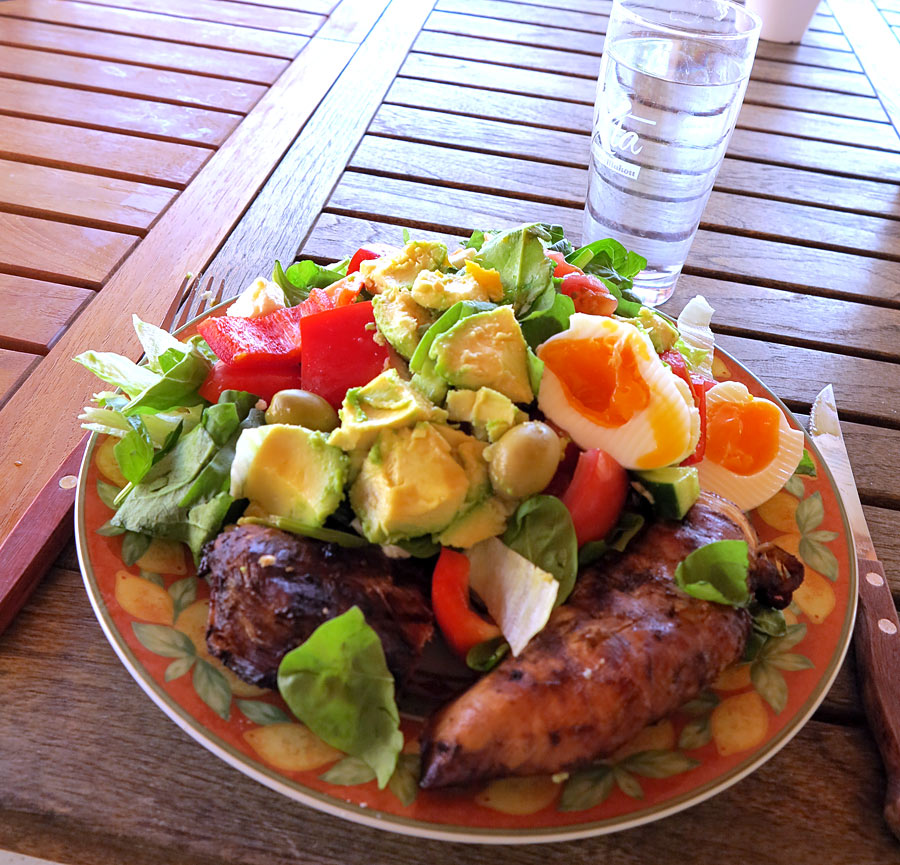 Lunch: Kyckling från grillen kvällen innan och världens godaste fetaostsallad med ägg och fantastiska oliver.
