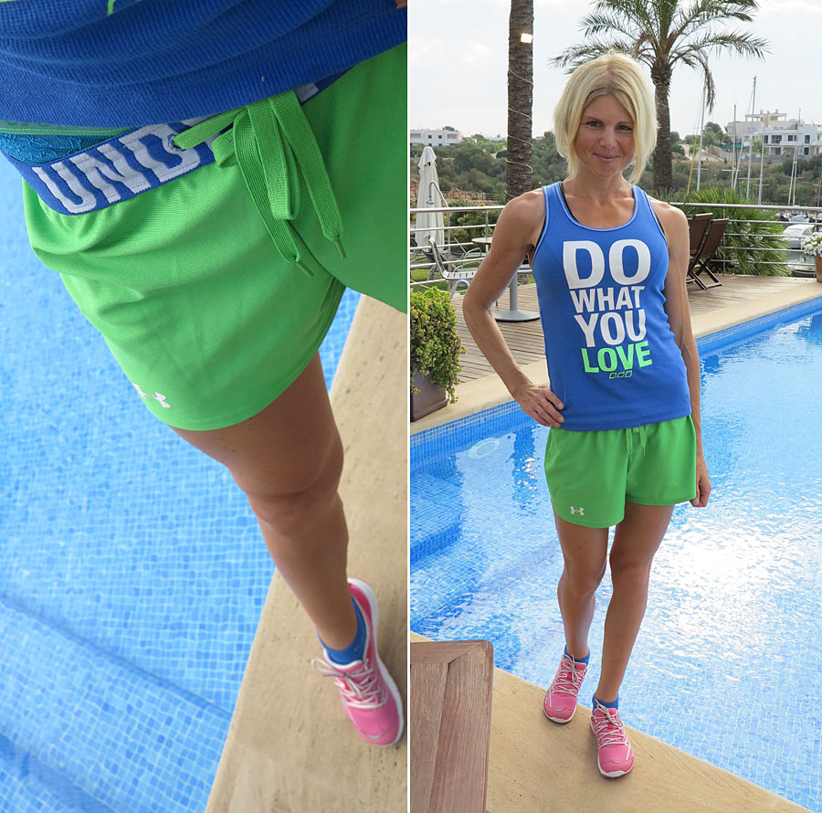 Lorna Jane börjar etablera sig i Sverige och kommer i höst till butik i Täby Centrum. Jag hade fått hem den här ”Inspirational Tank” (med snarlikt som mitt eget tryck jag hittat på till Stronger Label) + en pressinbjudan till en förhandsvisning i butiken medan vi var i Dalarna. Det fick åka med hit till soliga Mallis och matchar mina gröna Under Armour-shorts (och t.o.m. trosorna från Björn Borg) och Gococo-strumporna snyggt. Dessutom läckra framför poolen vid Yacht Club Cala dÓr där vi tränar idag.