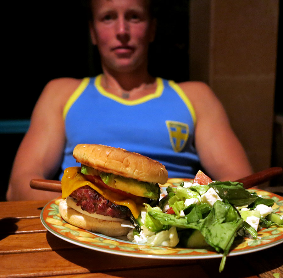 Hamburgerkedjorna varnas härmed för grillkung Christer burgare. Så otroligt goda. Saftiga och med fingertoppskänsla lagom hårt grillade. Toppade med cheddarost, avocado, smakriga tomater och en sjukt god peppardressing som Therese googlat fram – perfekta!