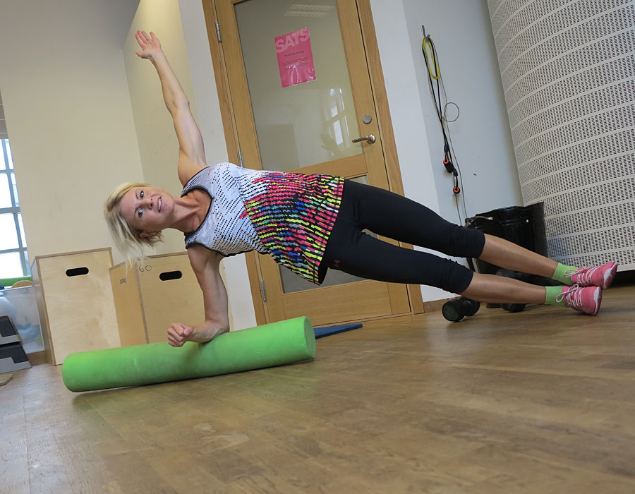 Själv undviker jag däremot alla tunga magövningar med benlyft och magen i utsträckt läge p.g.a. diastasen, så de få repsen i filmen var bara för er. Istället kör jag mycket coreövningar, typ sidoplankor av olika slag där inte de raka (delade) magmusklerna påverkas lika mycket. Ovan en med foamroller och armlyft.