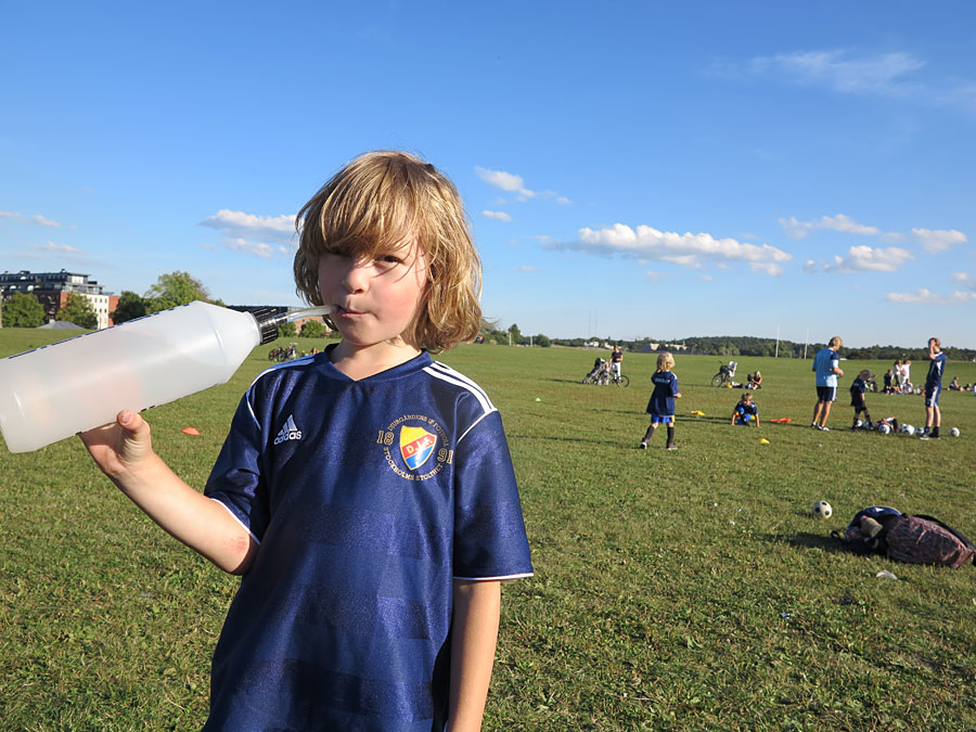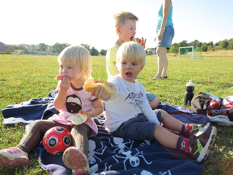 Vi vill uppmuntra barnen att sporta, och gör det säkert indirekt genom vår egen träning, men det är svårt att hinna med mer än en aktivitet var för dem. I alla fall tills de är så stora att de kan gå själva till sina träningar. I kväll fick alla hänga med, men fotbollsmorsan är bra på att planera och hade med korv i termos till hejarklacken. Det är inte kul att komma hem sent med 4 skrikande magar på släp.