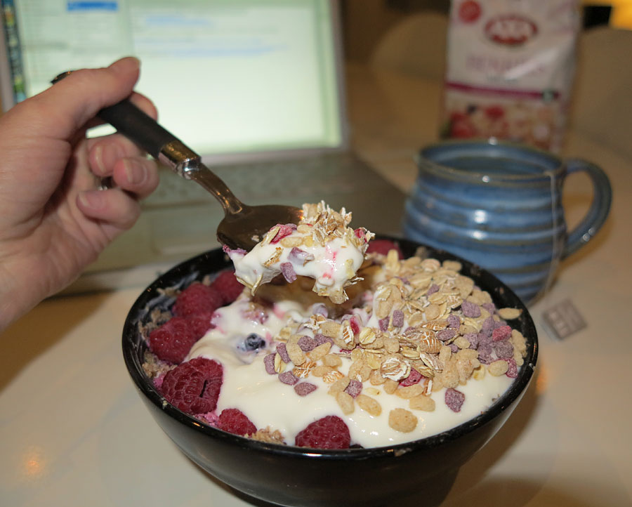 Dagens frukost och müslitest: kesella blandad med Gourmet-Pro vanilj och 1 msk kokosolja, naturell yoghurt, hallon, blåbär och AXAs Berries Müsli med hallon- och blåbärspuffar. Gott för magkänslan!
