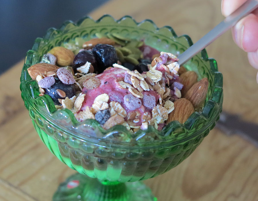 Familjen jobbar på hårt med vår hälsosatsning. Ändå blev jag chockad när Jonas plockade fram frysta blåbär, hallon, banan, ett äpple, Gourmet-Pro vanilj och naturell yoghurt till juicemaskinen i morse. Jag kompletterade även med en klick kokosolja, och resultatet blev en krämig god smoothie full av smak och näring. Dock var det bara han själv, Jonna och jag som vågade prova. Inte bara vuxna som utövar sin makt över det de själva kan kontrollera – vad som hamnar i munnen! 😉