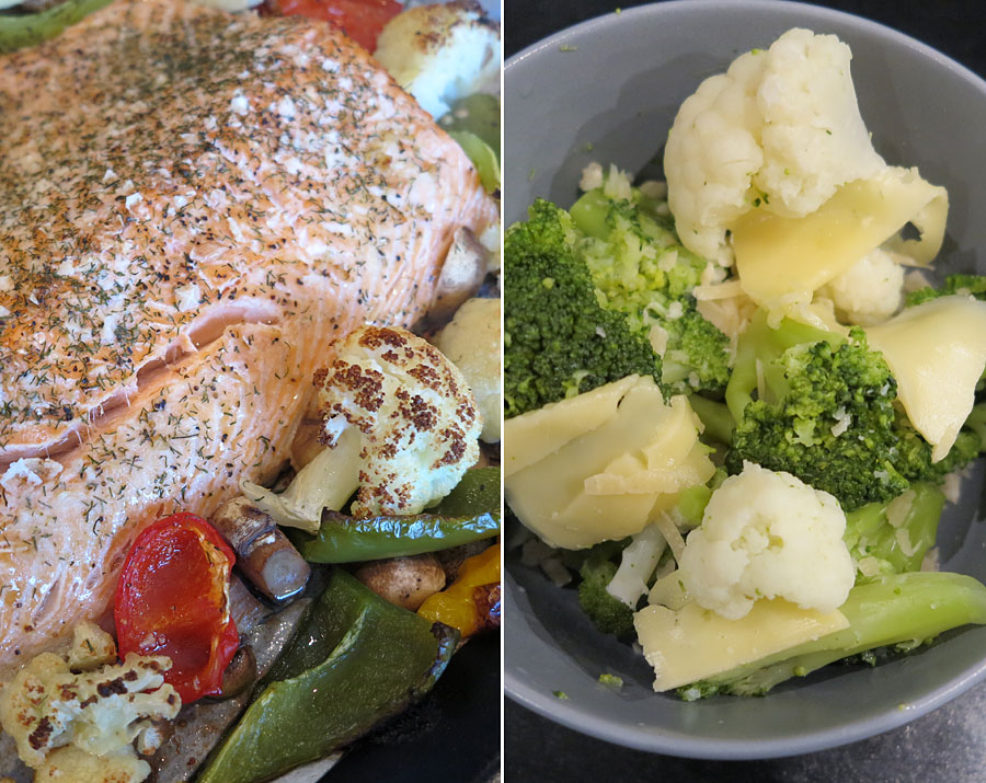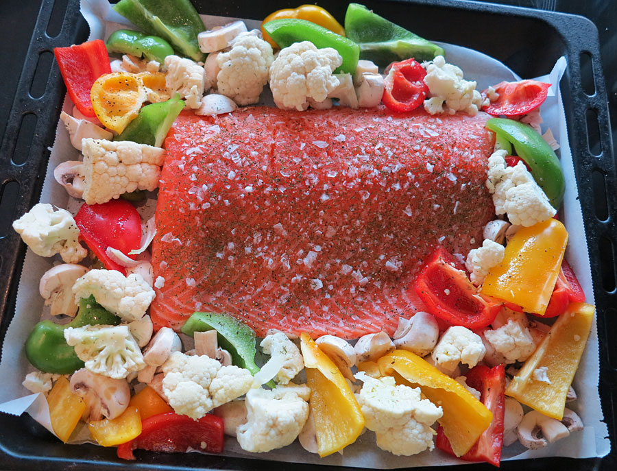Att man äter med ögat stämmer så bra. Vissa gånger på gränsen till att jag inte VILL äta maten så vacker den är. En plåt lax med flingsalt och dill, champinjoner, paprika i olika färger och blomkål med ringlad olivolja och örtsalt över. Rena rama mästerverket, både för smaklökar och ögon.