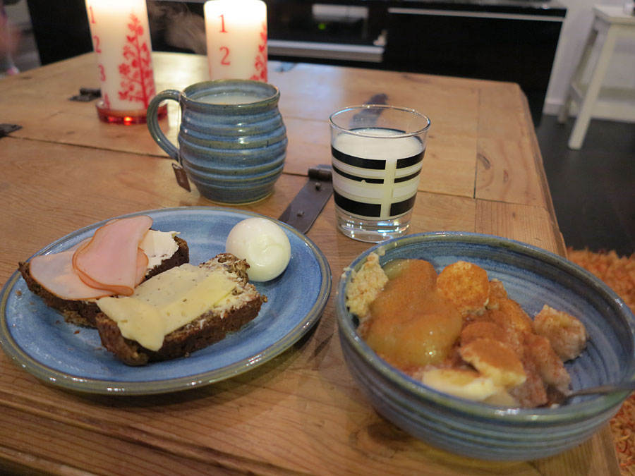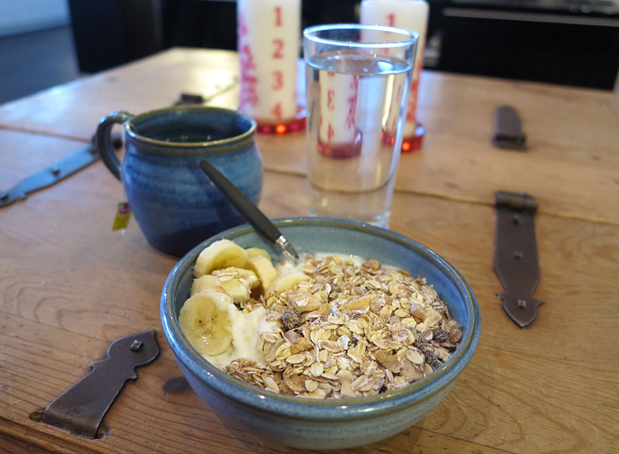 Frukost kl. 8: Havregrynsgröt av 1 dl gryn, 1 banan, 2 msk äppelmos (ej light), lite kanel, 3 dl mellanmjölk, 1 macka med 1 tsk smör och ost, 1 macka med 1 msk Philadelphiaost (ej light) och kalkon, 1 kokt ägg, 1 kopp te (+ en Omega-3-kapsel och Vitamineral-tablett – de enda kosttillskotten jag äter just nu).