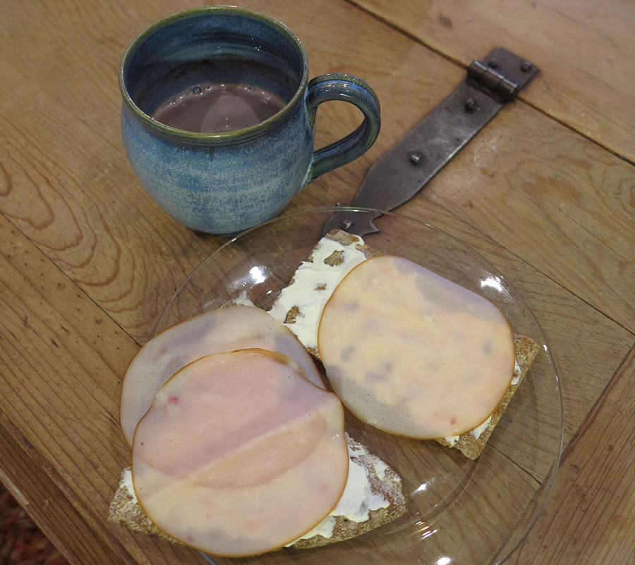 Kvällsmål kl. 20.30: 2 st knäckemackor, 2 msk Philiadelphiaost, kalkon, varm Oboy (2 dl mellanmjölk + 2 msk Oboy-pulver), 1 kopp te. Jag VET. Lite mycket Philadelphia/kalkon-mackor den dagen, men jag älskar den kombinationen.