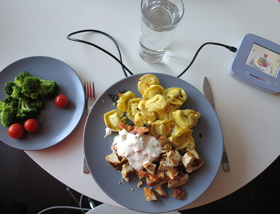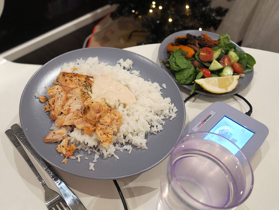 En läsare undrade hur en dags måltider ser ut nu när jag har ett speciellt matschema att gå efter. Nedan ser du exempel från igår när jag var hemma, en dag utan s.k. ”utmaningar” som jag byter ut vissa mål mot ibland. Allt ska ätas speciella tider där jag har ett par olika frukostar och mellanmål att välja mellan som ska följas med exakta mått. Lunch och middag bestämmer jag själv men äter på Mandometervågen som jag väger upp exakta portioner enligt personliga inställningar, mina med 50% kolhydrater, 40% protein och 10% fett (eller ”sås”). Grönsaker äts separat. Dessa måltider ska även intas under en viss hastighet, och med jämna mellanrum anger jag min mättnadskänsla i en skala på monitorn. Lite meckigt, men man vänjer sig och ska ju inte äta med vågen för evigt.