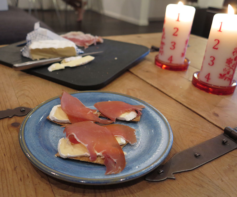 …och mumsiga kex med brieost och parmaskinka till kvällsfika. Där är ett tips att jula till det och ha pålägget på pepparkakor istället.