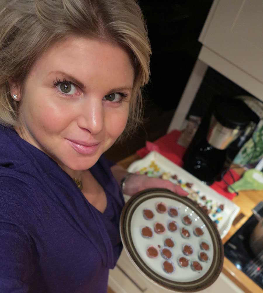Fusk-ischoklad: Smält choklad (mörk/ljus eller både och) + nougat över vattenbad. Fyll med liten sked i knäckformar och låt stelna.