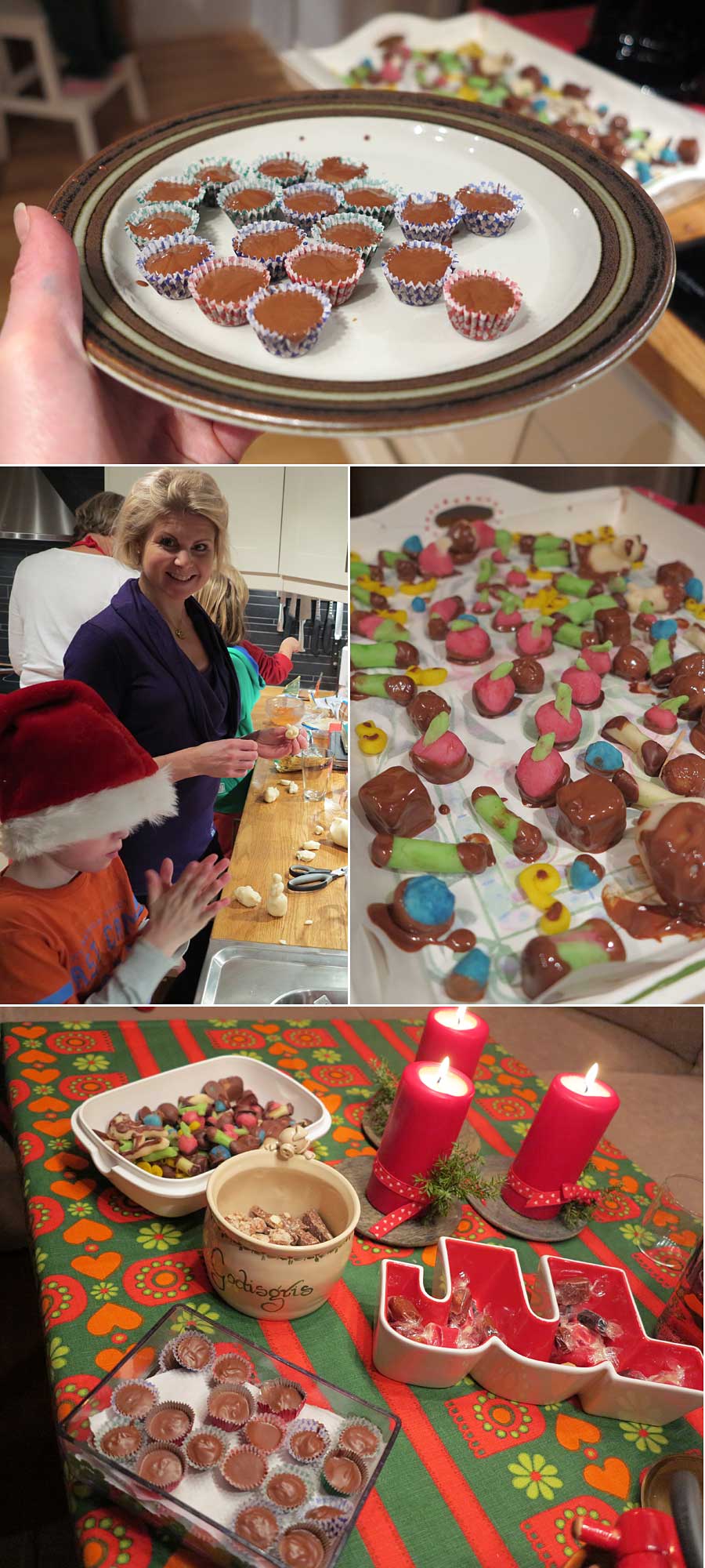 Det behöver varken ta tid eller vara svårt att göra eget julgodis. Inga lyxiga praliner a´la Ernst, utan vi sänkte nivån till barnens. Allt som behövs är marsipan, karamellfärg, blockchoklad (alt. annan), nougat och knäckformar.