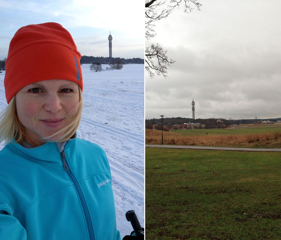 Förra året däremot var jag glad över snön. Då satsade jag för fullt mot Vasaloppet Öppet Spår, och åkte som mest 16 varv (á 2,5 km) runt Gärdet. Bästa och skönaste träningen jag vet är att glida runt på skidor, men med tanke på hur Gärdet ser ut idag (högra bilden) är tajmingen perfekt att istället satsa mer på mental träning 🙂