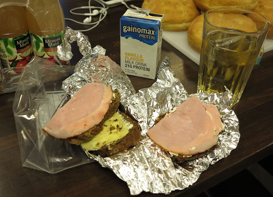 Frukost nr 2 (intogs efter träning på KTH-Hallen): 2 skink- och Philadelphiamackor, 1 smör- och ostmacka (bakade nytt P-bröd i förrgår – SÅ gott!), 1 Gainomax (tillåtet trots att det är lite kosttillskottsvarning) och 1 kopp te.