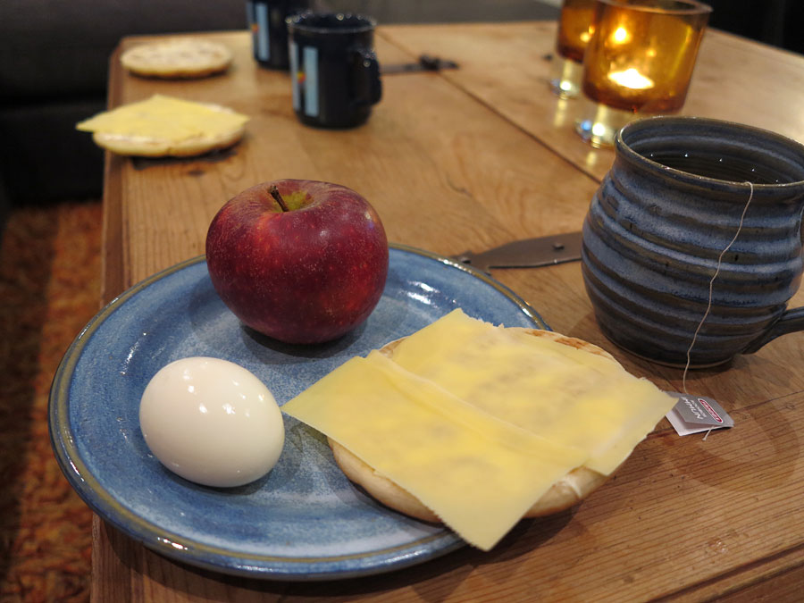 Kvällsfika: Ostmacka, ett ägg, ett äpple och en kopp te.