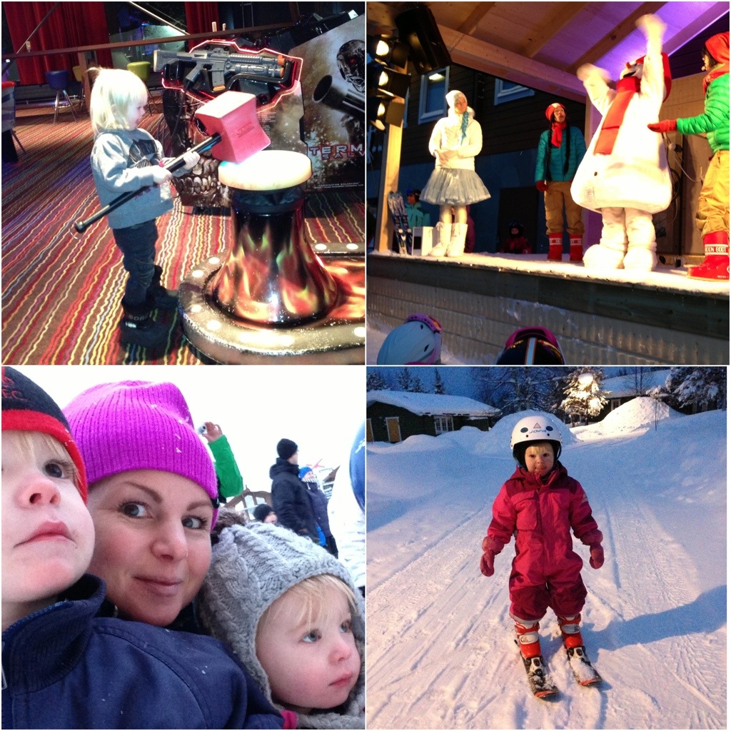 Storbarnen är på äventyrsbad medan tvillingarna och jag precis har kommit hem från en show med snögubben Valle här. En utomhusteater med sång och massor av barn. Jonna och Junior älskar det och var där igår med pappa medan jag åkte längdskidor. Lindvallen är grymt barnvänligt på så sätt, med sin maskot Valle, massor av barnliftar, lätta backar, speciella banor uppbyggda med hinder, lekplatser och Experium med spelhall, äventyrsbad, lekland, restauranger och bio. Allt i närheten till stugan vi hyrt, vilket förenklar när man ska hitta på saker för 4 barn mellan 2 och 8 år.