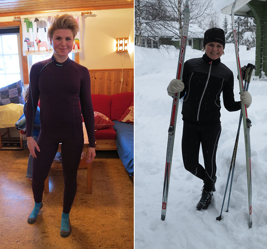 Gårdagens skidkläder: Underställ – Craft, sport-bh och långa kompressionstrumpor i ull – Gococo (missa inte att tävla om ett par), varmfodrad jacka och tights – Röhnisch, fleecemössa – Merrell, vantar – ett par i skinn av okänt märke.
