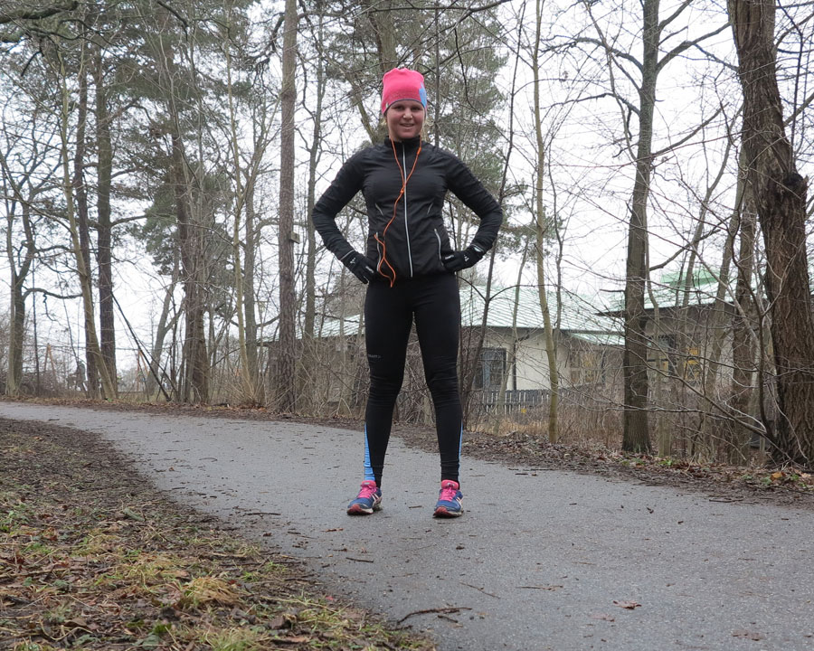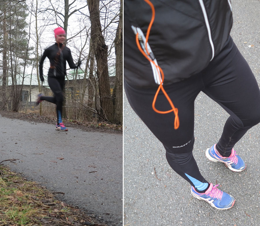 När det var tungt sänkte jag tempot och lät pulsen sjunka medan jag drog upp mina gamla Craft-tights. Mina första löptights jag ägt, från runt 2003, som nu blivit lite slappa i midjeresoren men fortfarande är på topplistan av favoriterna. Så sköna och urtvättade att jag bara inte KAN kasta dem, trots att jag har så många par. Jackan är från Casall, mössan Seger, vantar och strumpor från Craft och skor från Asics.