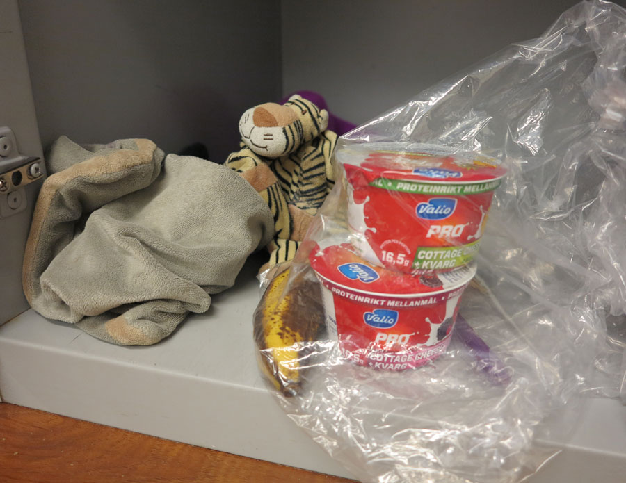 Mellanmålet intogs direkt efter träningen i omklädningsrummet i sällskap av Juniors Tidis och Jonnas Fantis. Dom fick följa med till förskolan men liftade sen med i min ryggsäck.