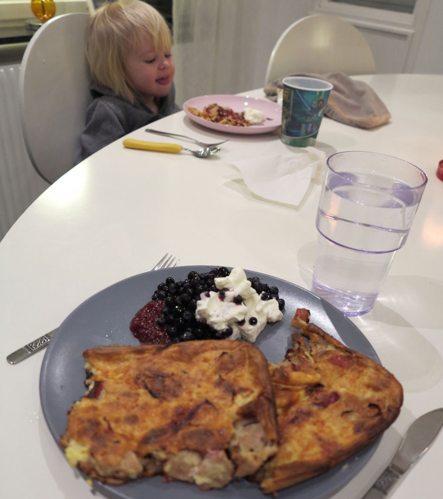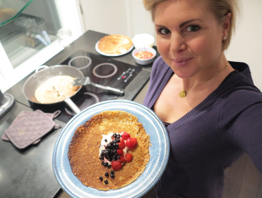 Jag brukar göra smeten på dinkelmjöl för en mer näring utan skillnad på smaken, och favoriten är med skinka eller bacon som först får stekas i ugnen innan jag häller på smet. Volla – en fläskpannka! Passande till är att mixa lingon och socker till en god rårörd sylt, men blåbär funkar också till.