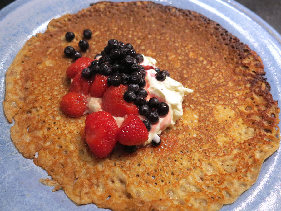 Andra goda pannkaksvarianter är med äppelskivor och kanel, rivna morötter för att lura i barnen lite grönsaker, blåbär, överdosera med ägg för en proteinrikare ”omelettpannkaka”, som crêpe med champinjon- eller räkstuvning, av mosad banan (till en bananpannkaka), med lönnsirap, som efterrätt med glass och chokladsås, av kokosmjölk, av mandelmjöl eller keso. Fler förslag?