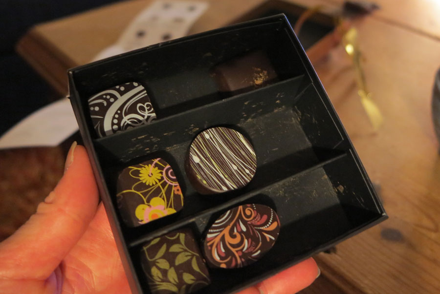 Och detta utan Ben & Jerry´s hjälp. Inget bra utgångsläge om jag ska vara skrockfull, men jag laddade upp med Shake Mushi + att Jonas hade fått en ask lyxchoklad från Bönor & Blad när han föreläste på Friskis. Dessa vackra praliner smakade vi istället av framför Robins och Plura. Så fin att det krävdes manual för att förstå sig på dem, men jag hittade några riktiga godbitar med hettande chili och kardemumma.