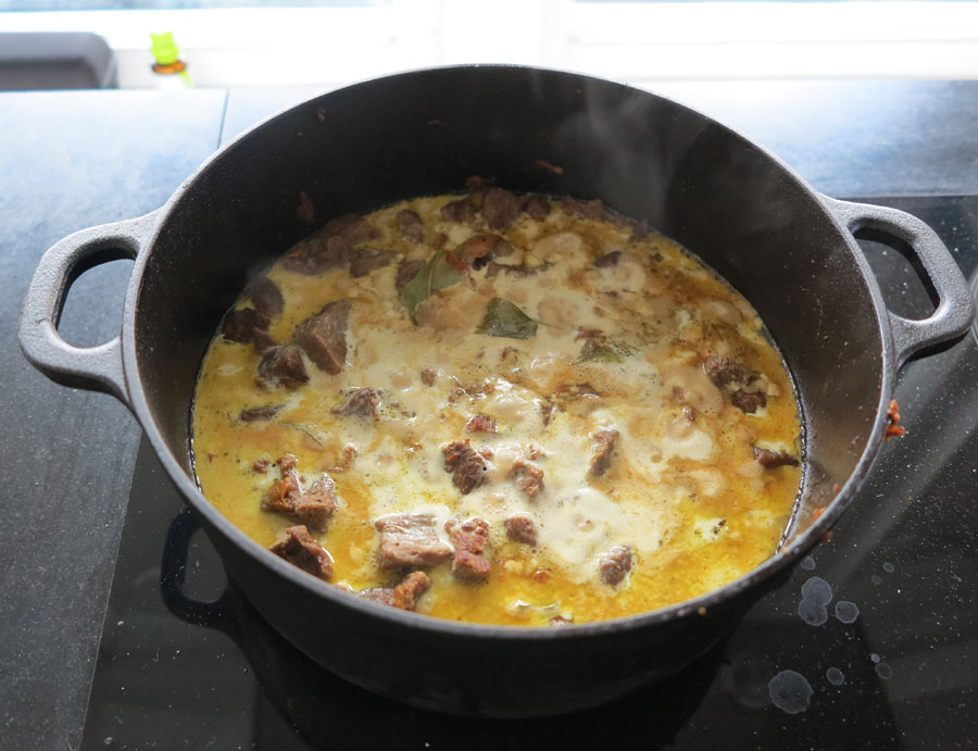 Ida – det var bara stekta grytbitar av nötkött, kantareller, buljong, vispgrädde, salt, peppar, lite sojasås och lagerblad. Sen fick den stå på spisen i säkert 6 timmar och blev riktigt mör och god ihop med potatismos 🙂