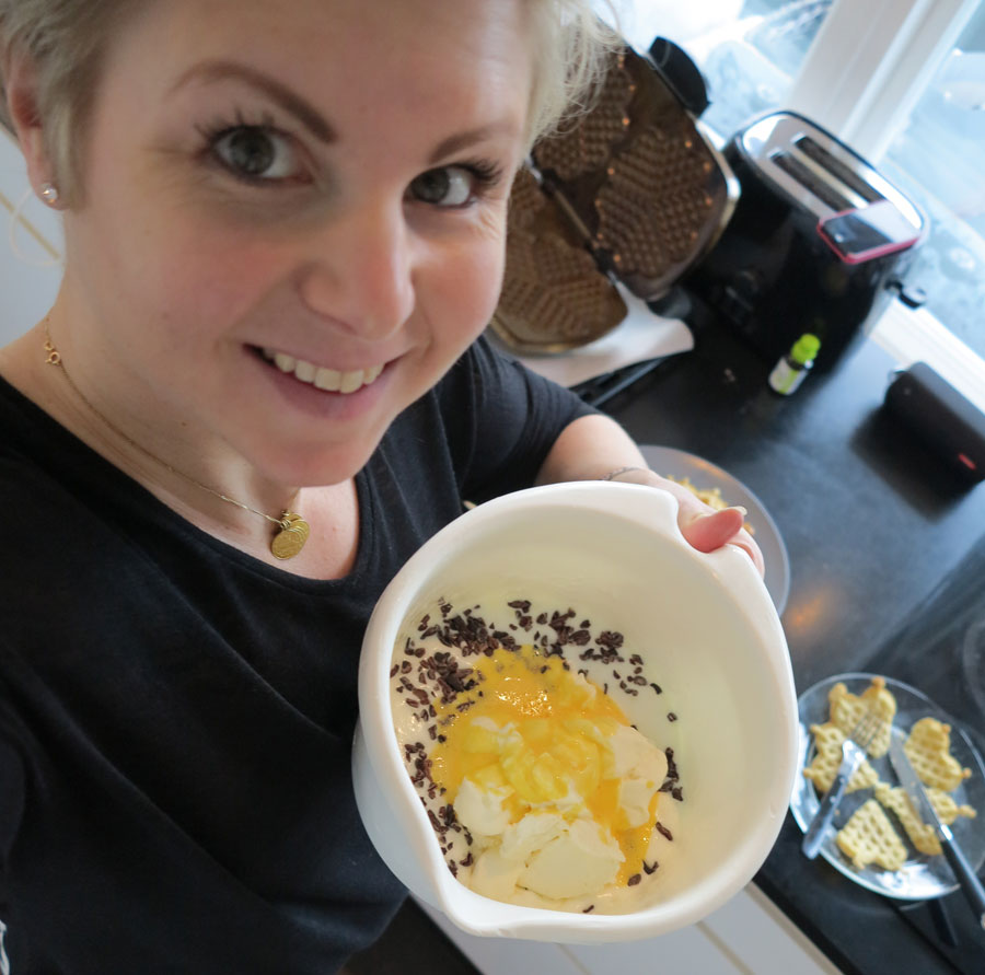 Jag har svårt att slänga mat, så när vi hade grädde med kort datum hemma igår, gjorde jag våfflor med vispgrädde, bär och sylt till middag. Den överblivna grädden blandade jag sen ihop med uppvispad äggvita + socker, uppvispad äggula och kakaonibbs. Nu ligger glassen i frysen och gottar till sig (grundrecept här, men med nutella). Super!