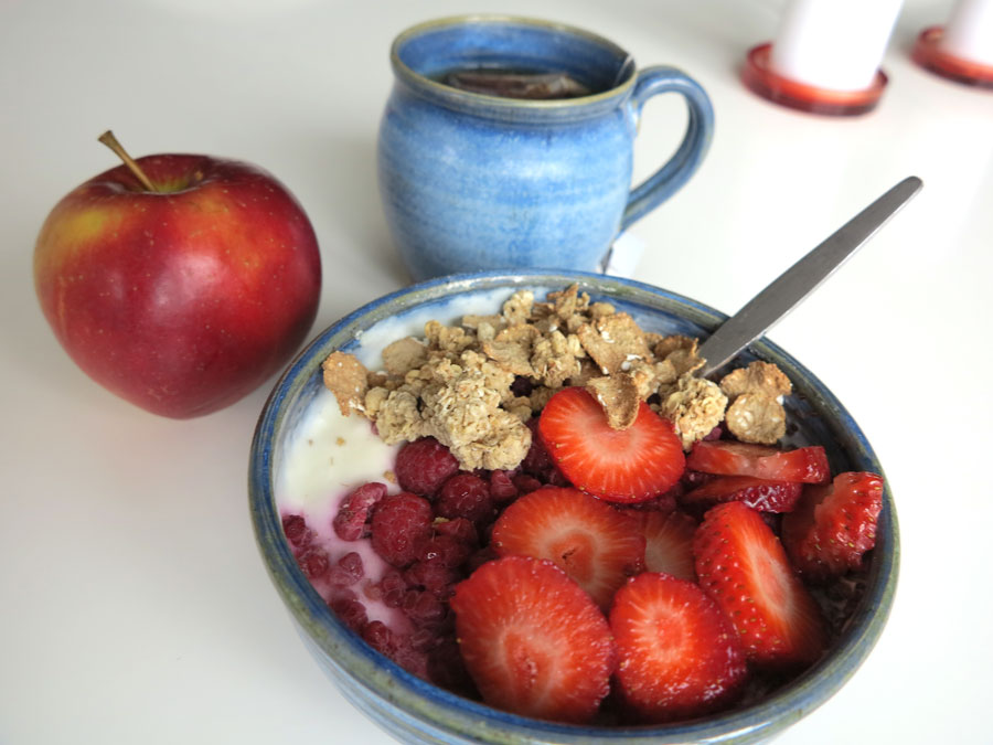 Färska jordgubbar finns att köpa året runt i de flesta butiker, men jag tycker det bär emot att köpa när de inte är Svenska. Vi har en liten mataffär alldeles intill där vi bor – varken ICA, Coop eller annat känd kedja, men ofta med bra erbjudanden och specialprodukter. 10 kr för en ask Belgiska jordgubbar kunde jag inte motstå. Årets första färska för mig, och de hamnade både på gårdagens frukost..