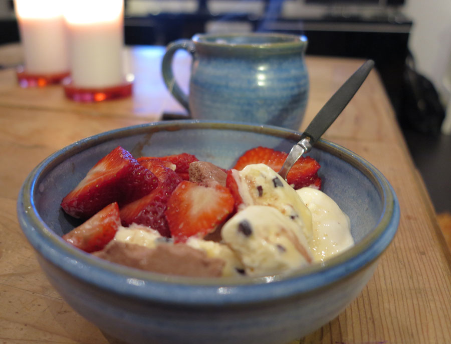 …och gårdagens kvällsglass. Nej – inte lika smakrika som närproducerade jordgubbar, men helt ok. Och tillsammans med hemgjord grädd- och kokosglass blir allt gott.