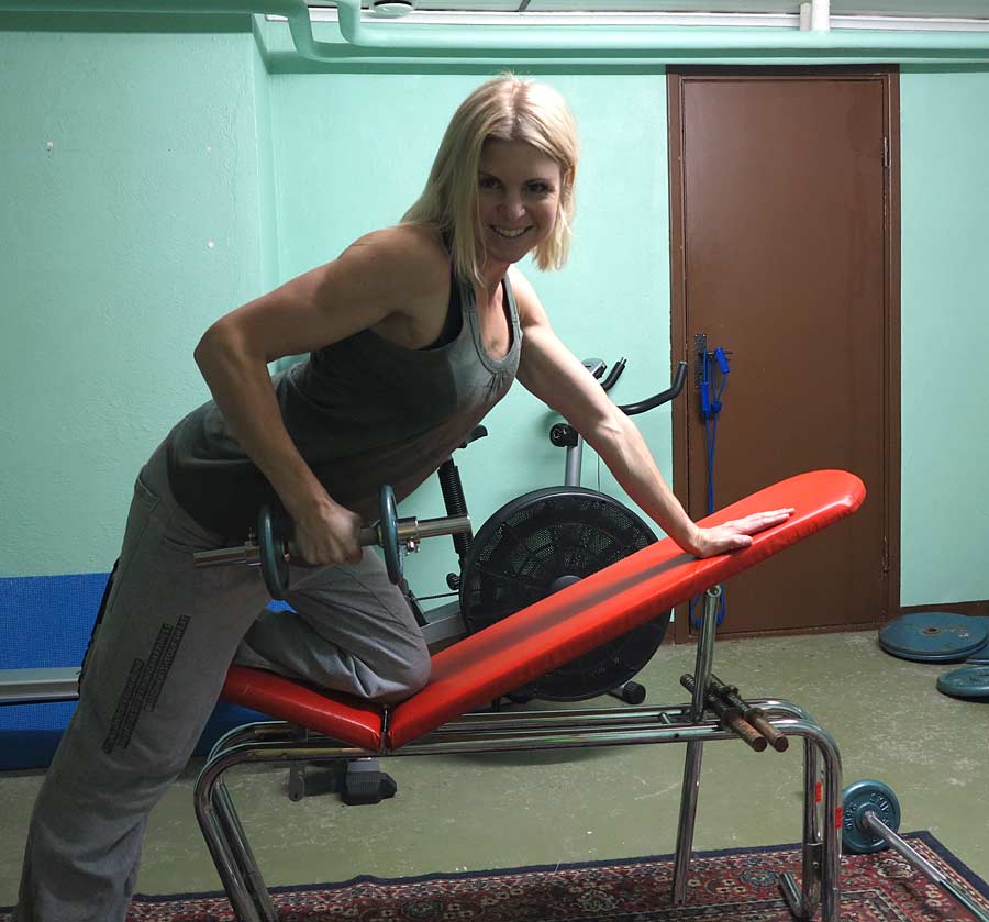 Jormgymmet har sorgligt nog flyttat från den lilla källaren det var i förut. Man måste lösa årskort och låna nyckel på ett annat ställe, men jag prioriterar utomhusträning mer när vi är här och ids därför inte. Skidåkning är ändå så allsidig träning för hela kroppen så styrketräningen får vänta en vecka. Men för din skull har jag plockat fram ett träningspass i repris från december 2012 för rygg, baksida axlar och triceps.