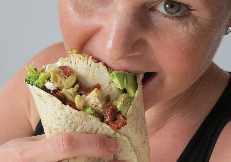 Därav snabba puckar när det kommer till hemmalunch. Oftast tar jag rester från tidigare middagar eller hackar en sallad, och till sistnämnda är det smidigt att stoppa in allt i tortillia- eller pitabröd. Det gjorde jag idag med extra fina grejer – sallad, paprika, soltorkade tomater, keso, smulad fetaost, hemgjord hummus, kyckling, broccoli, pumpakärnor, avocado. Gäller bara att inte fylla brödet med för mycket – då blir det svårt att gapa och allt trillar allt ut.